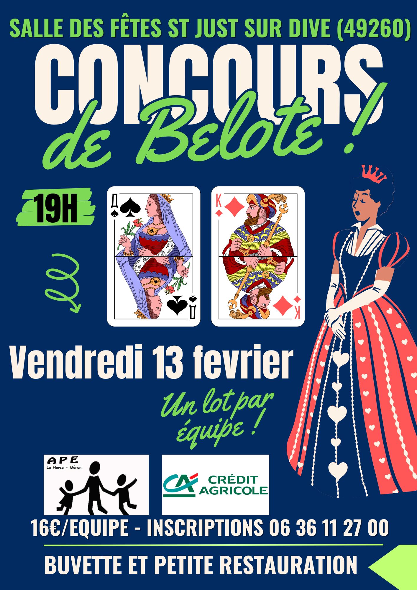 Concours de belote Le 13 février 2026 [𝐂𝐨𝐧𝐜𝐨𝐮𝐫𝐬 𝐝𝐞 𝐛𝐞𝐥𝐨𝐭𝐞] L'Association des Parents d'Elèves Méron-La Herse organise son premier concours de belote ! 𝐈𝐧𝐟𝐨𝐫𝐦𝐚𝐭𝐢𝐨𝐧𝐬 𝐩𝐫𝐚𝐭𝐢𝐪𝐮𝐞𝐬 : Vendredi 13 février à 19h Salle des fêtes de St Just sur Dive. 16€/équipe - inscriptions au 06.36.11.27.00 Tweet